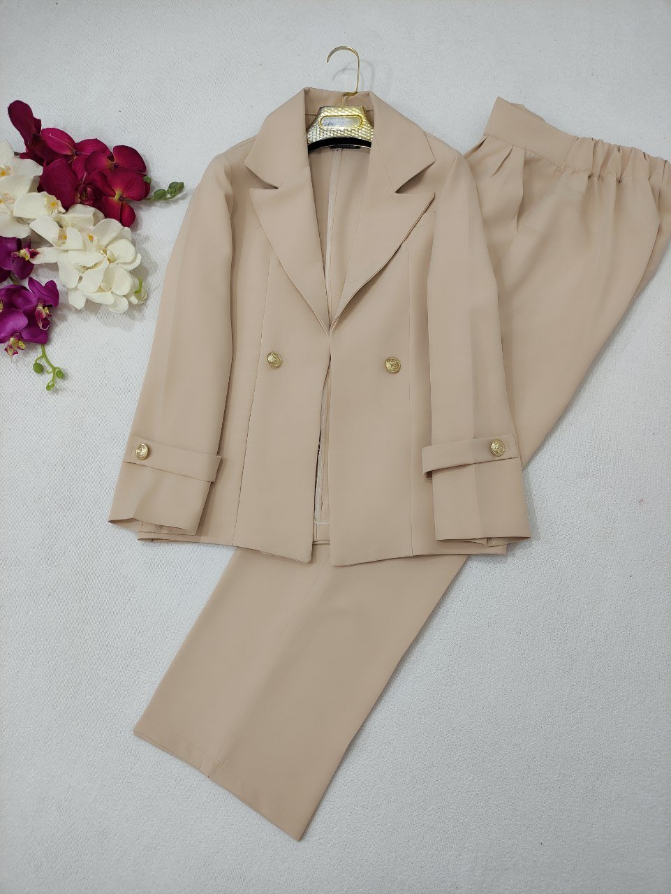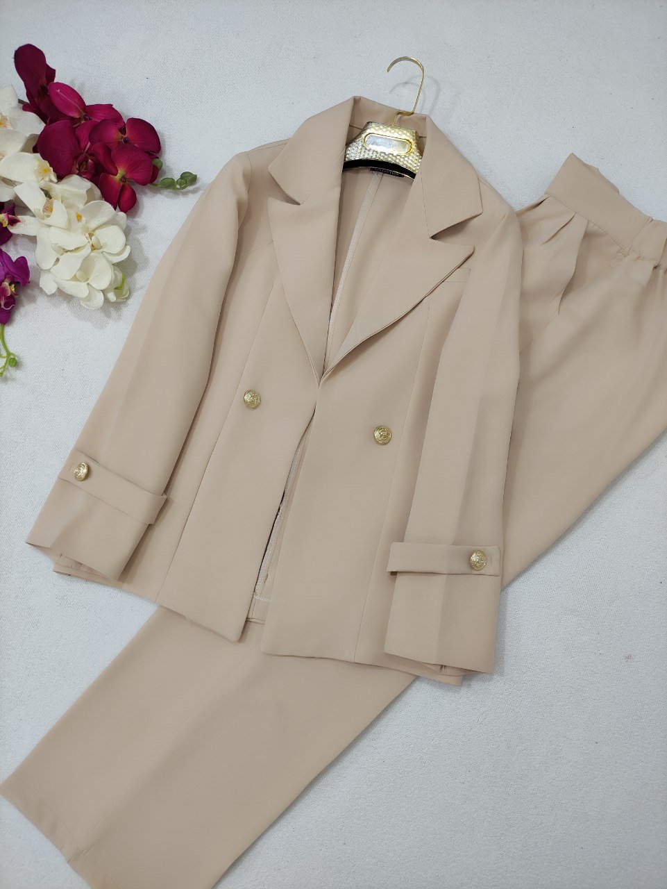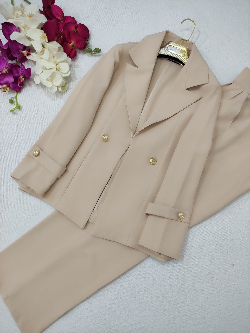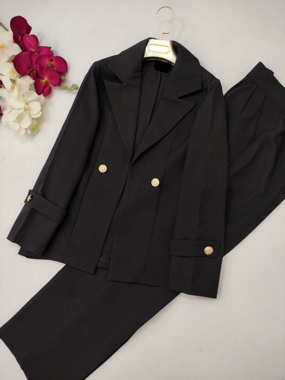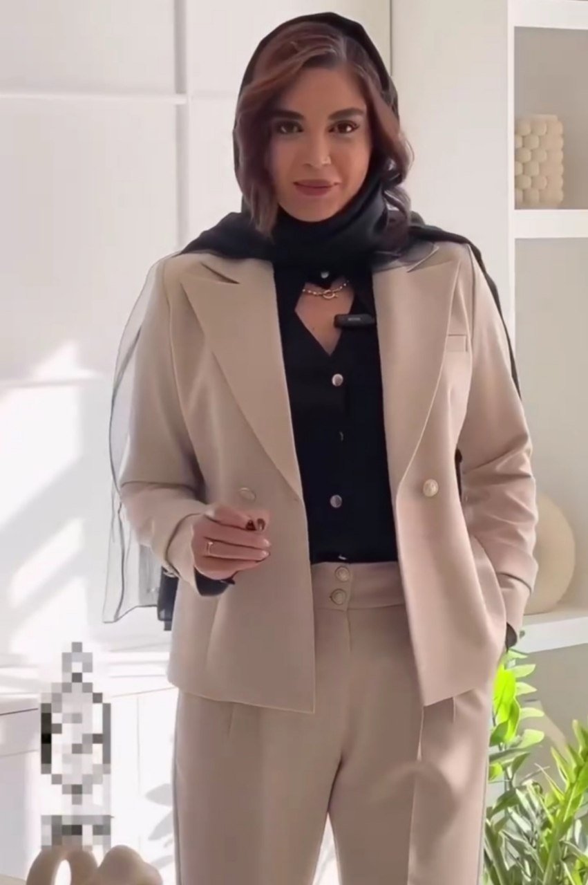 📌 این کت و شلوار را میتوانید با شومیز مشکی رعنا، اکسسوریهای مینیمال طلایی و کفشهای پاشنهدار کلاسیک ست کنید تا جلوهای شیک و جسورانه به استایل خود ببخشید.